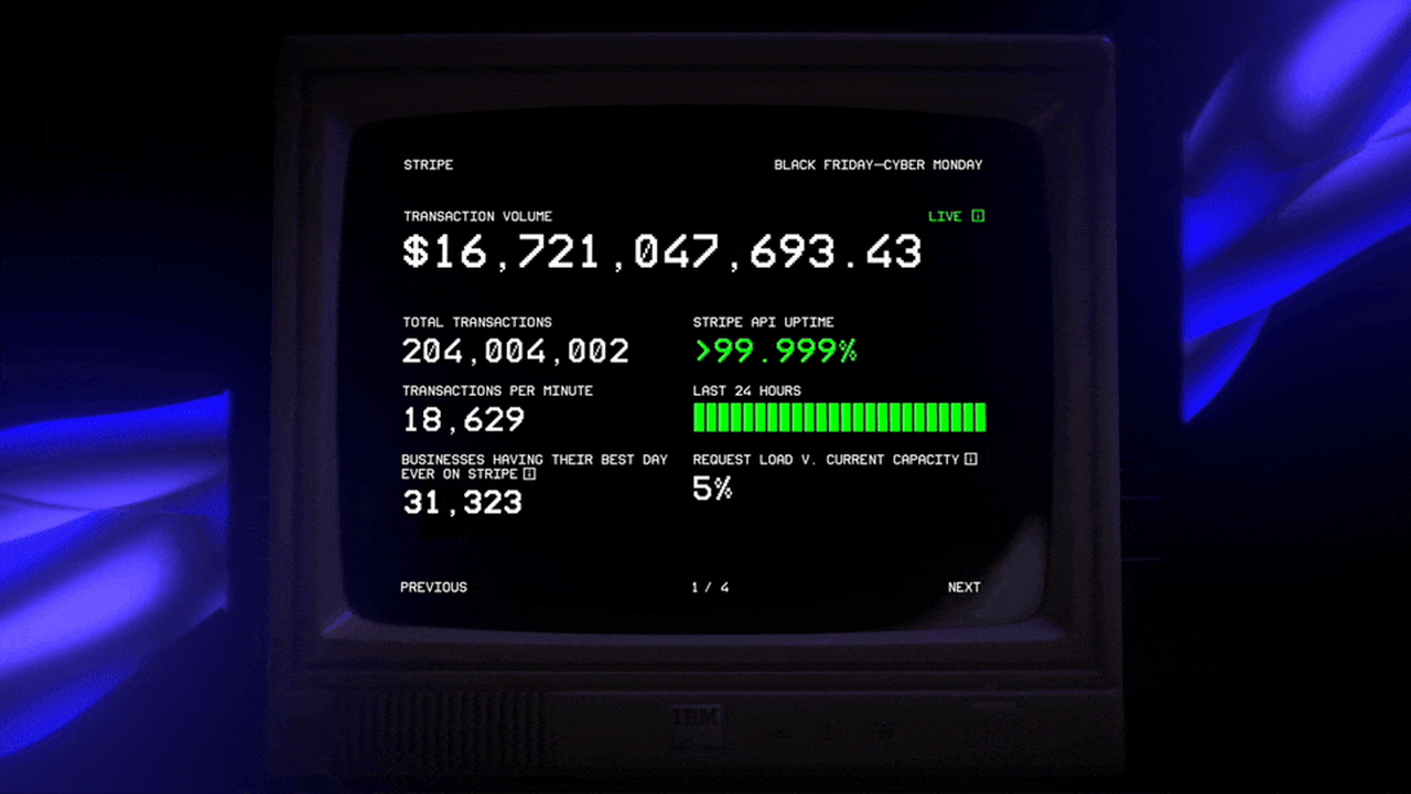 In response, employees from across the company came together to construct a real-time, publicly accessible microsite that dynamically showcased Stripe's reliability, transaction volumes, global activity, and more, during BFCM—and they showcased it all on Vercel.