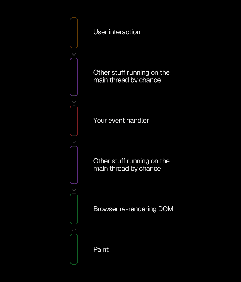 This is your code which is reacting to the user’s interaction. It may fetch some data, immediately change the DOM, or do anything else. If it does change the DOM, then the specific way in which way it does that will impact the time the browser needs to render the new state.