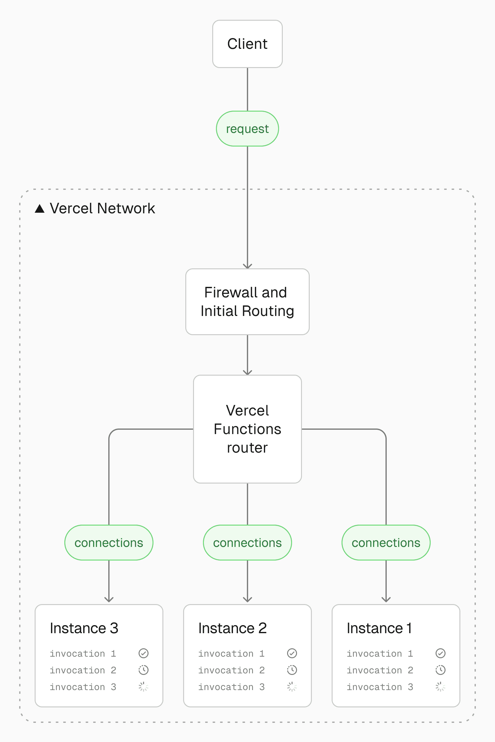 Vercel Functions router applies Fluid principals to optimize execution. It dynamically assigns requests to instances based on real-time metrics such as load, availability, and type.