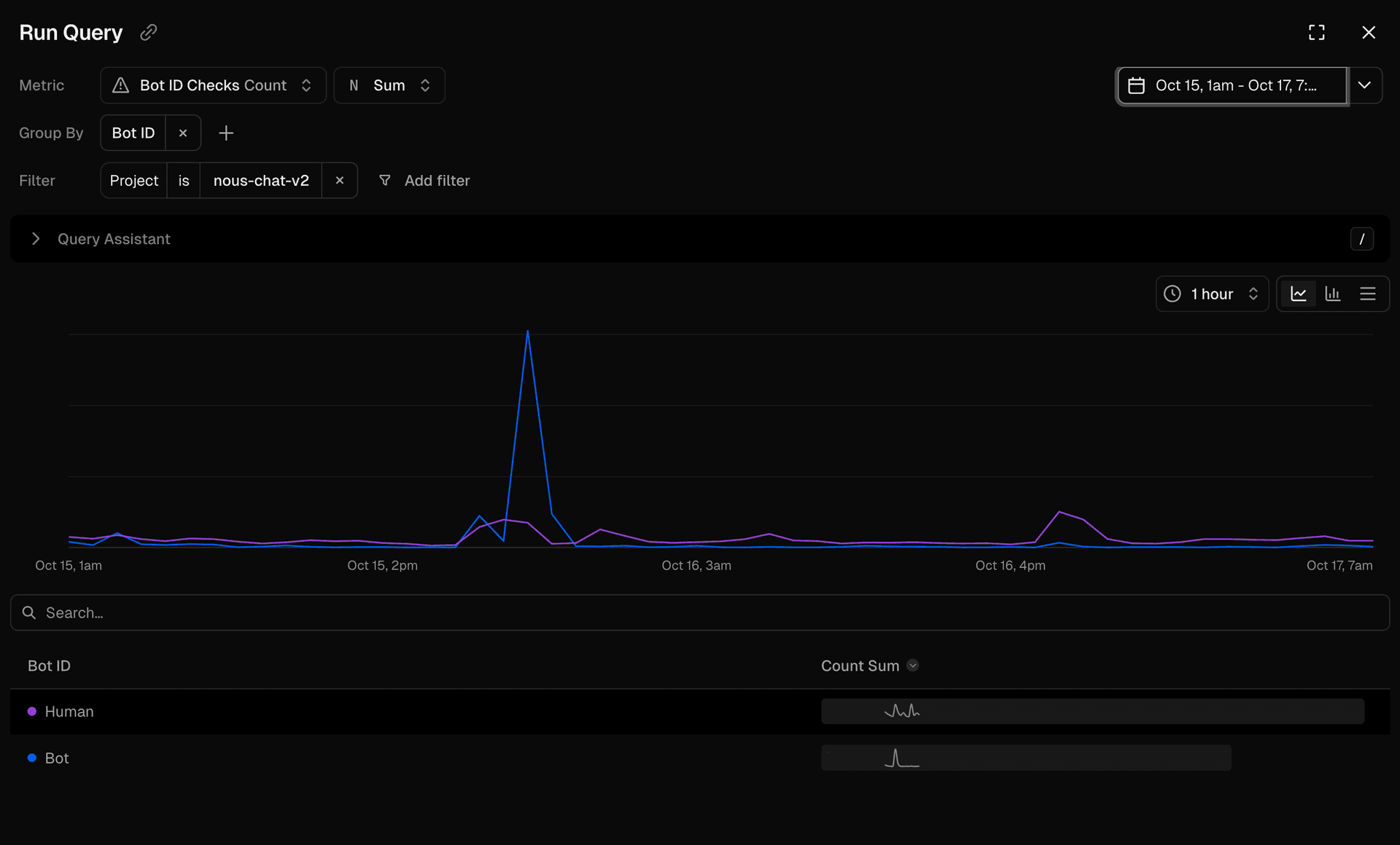 On October 16th around 12pm AEST, Nous quietly reopened its free tier without marketing promotion. Within a few days, Vercel BotID detected and mitigated a coordinated attack that found the open chat and tried to exploit it.