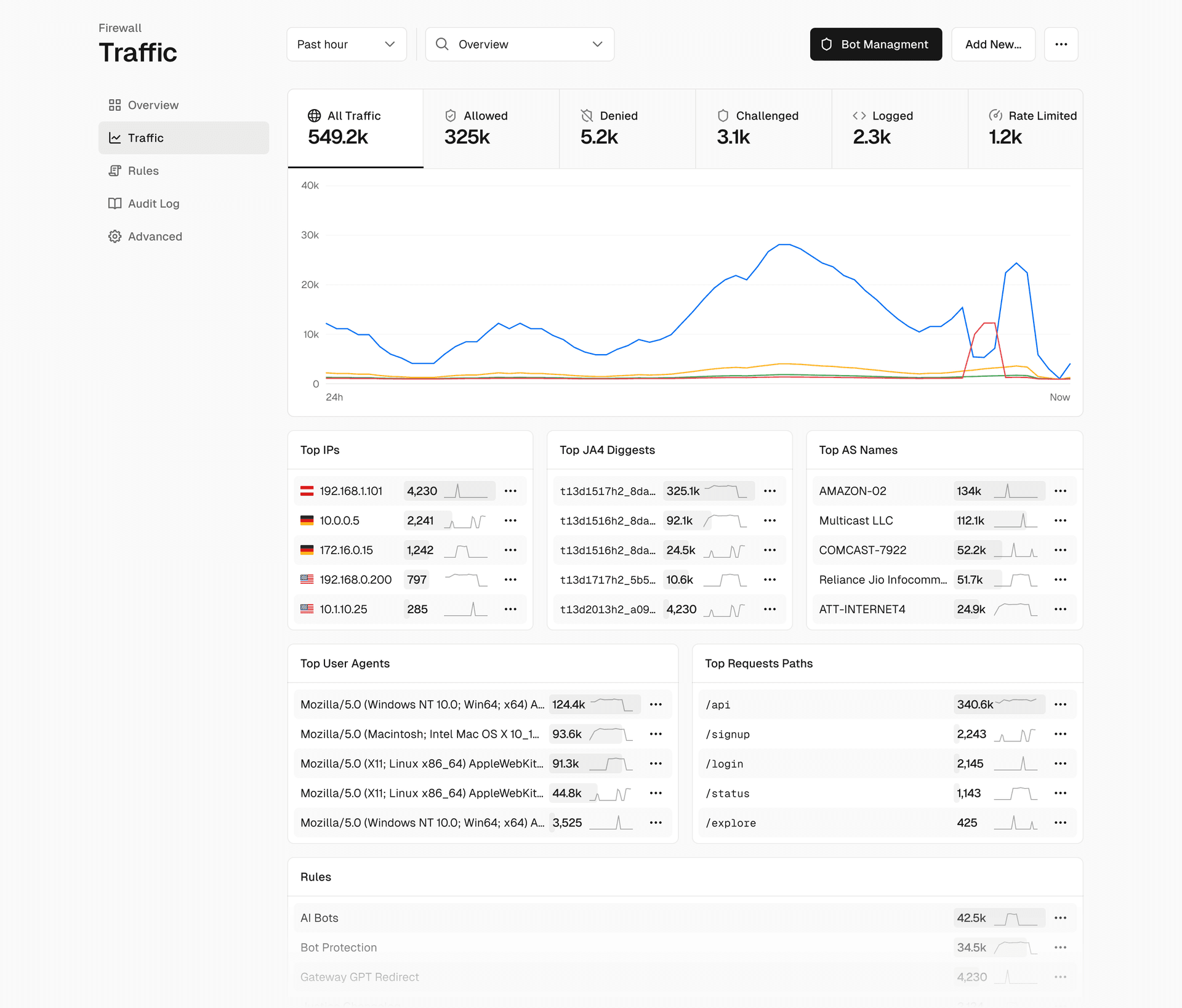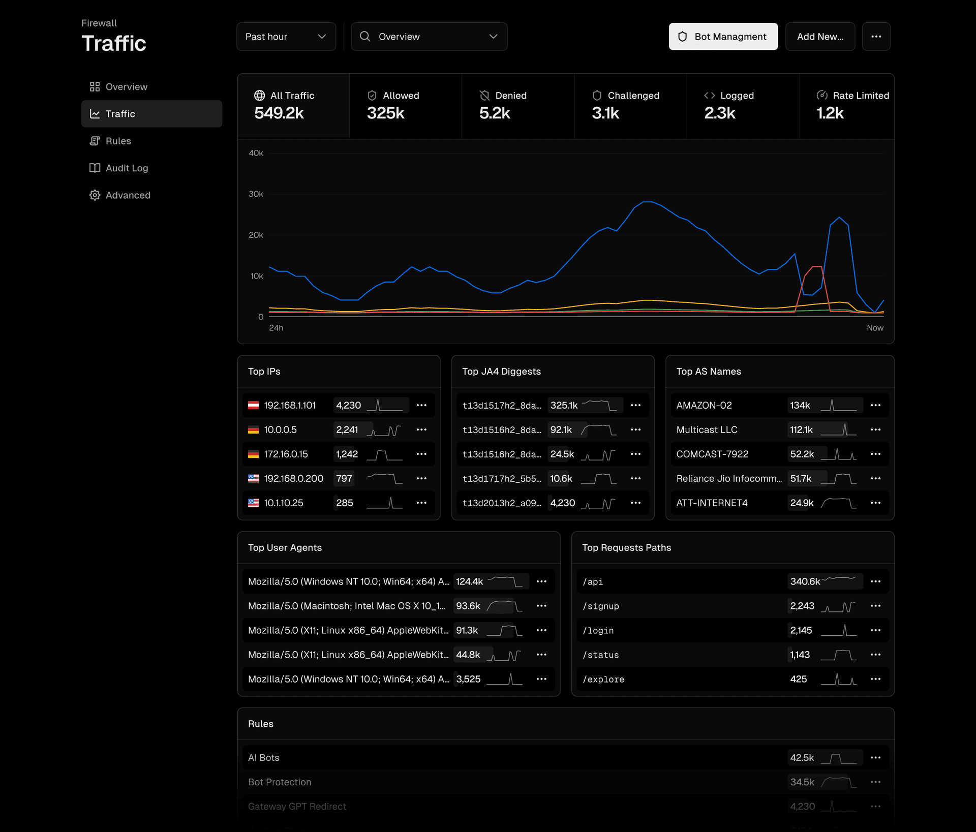 The new Traffic page focuses entirely on understanding activity across your site. You can now drill down into the detection signals that you care about the most, and filter those signals based on specific mitigation actions on the traffic tab. These updates make it easier to spot patterns or anomalies before they become problems.