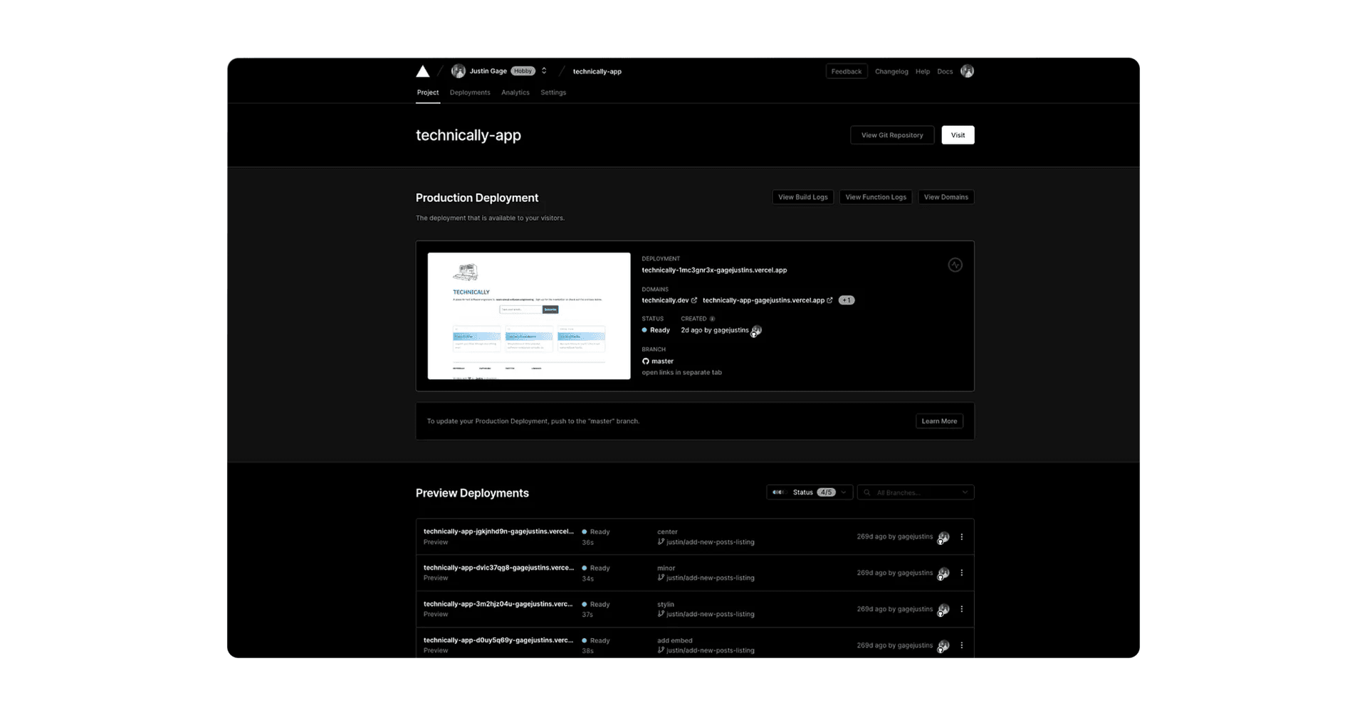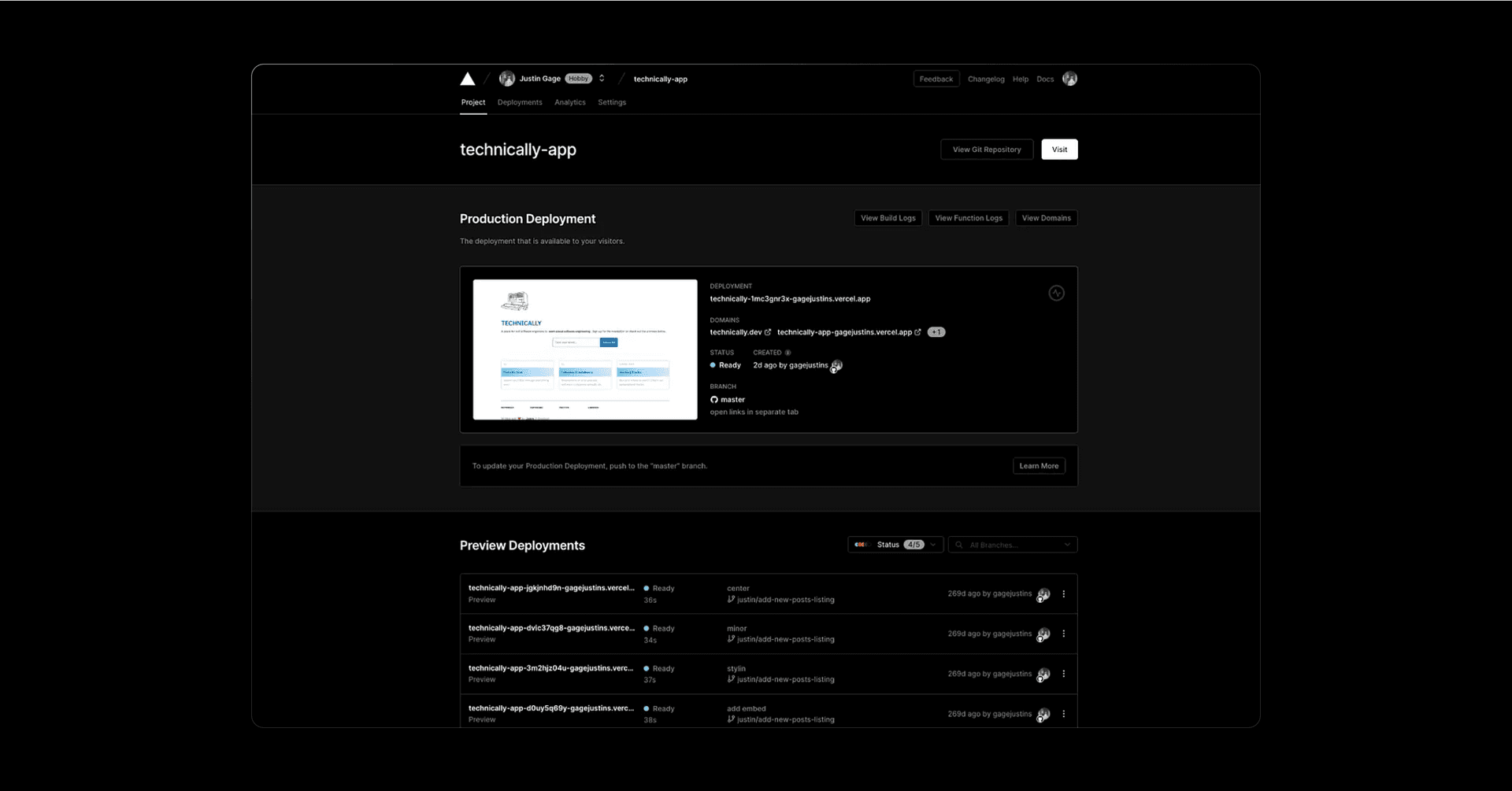 Finally, by default, Vercel assigns a random URL to your project so you can access it on the web right away. But you can easily add your own custom domains, like I’ve done here with technically.dev. Fun fact though, you can access an old version of the site at https://technically-app.vercel.app/.