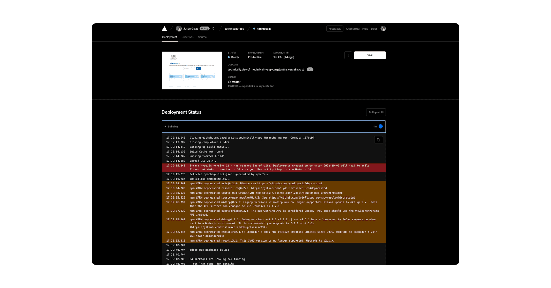 If I want to make changes to my website, all I need to do is push those changes to my GitHub repo, and Vercel automatically redeploys the site and puts the new code on the server. You get this nice dashboard for each site you have deployed that gives you information on status, recent deploys, and what domains it’s sitting at.