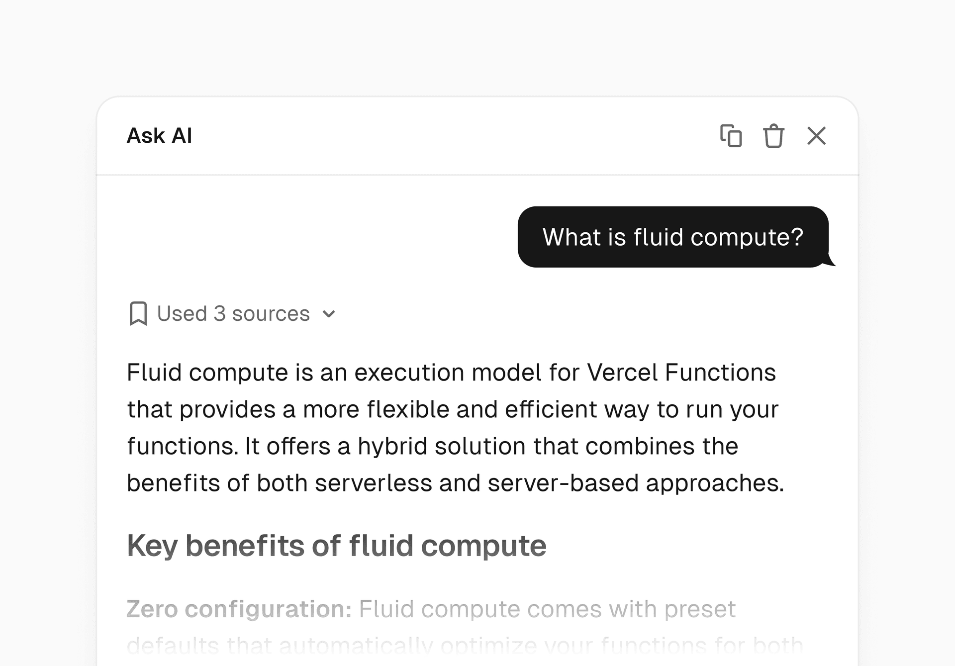 We're excited to announce that AI Chat is now live within the Vercel docs along with a subtle design overhaul. You can now get instant, conversational assistance directly on all docs pages.