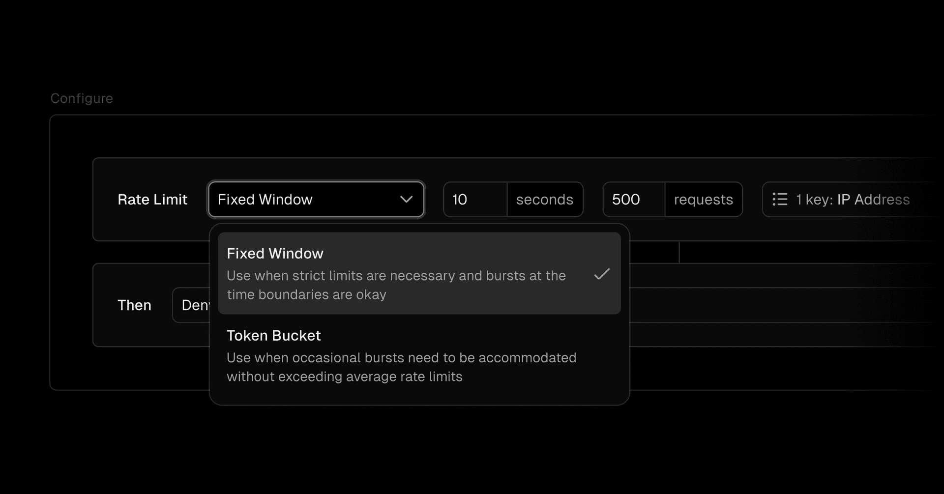 With over 15 parameters, including target path, headers, method, and cookies, you can define the business logic for rate limiting. Then, apply a rate-limiting algorithm tied to IP, JA4 digest, headers, or user agent to control the frequency of matching traffic within your set limits.