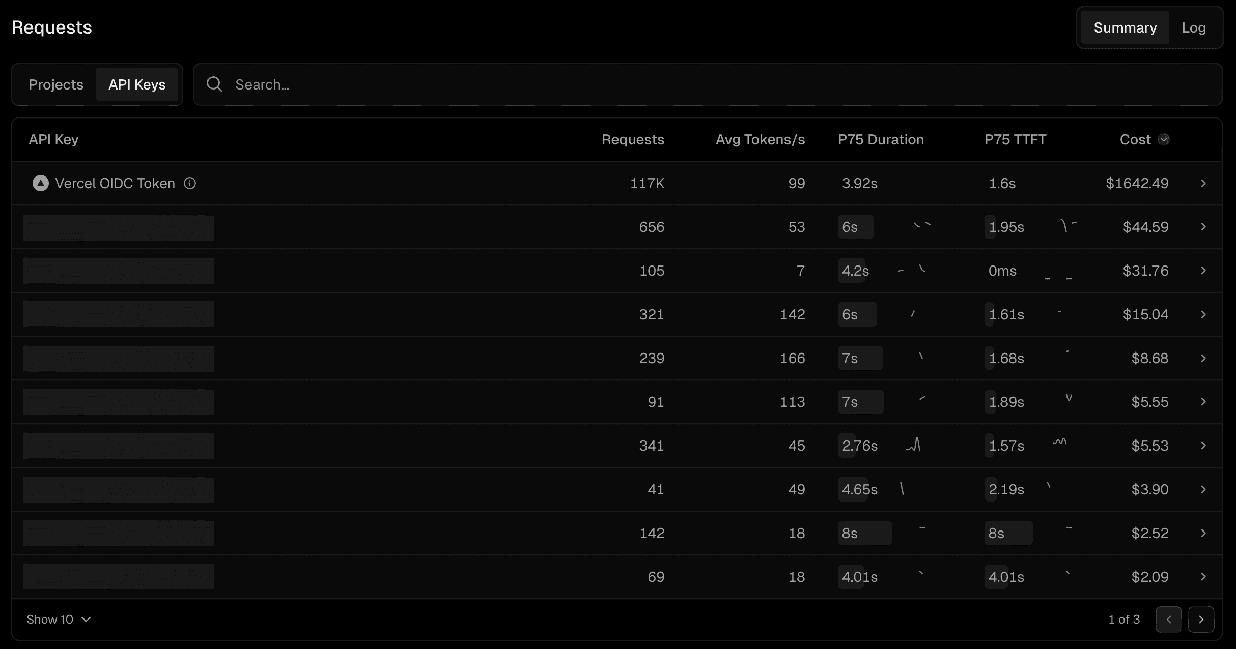 - Requests: Summaries by project, API key, and a detailed log of all requests