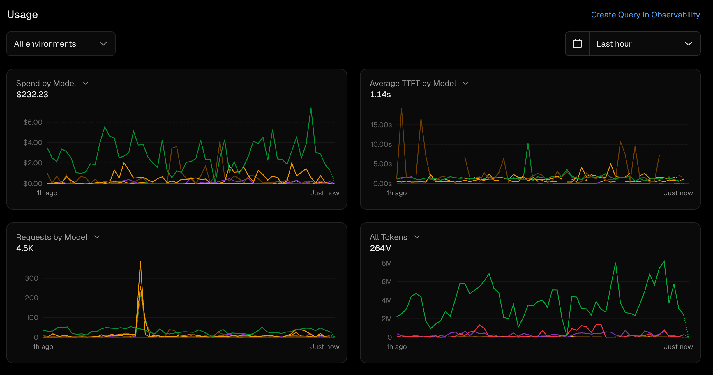 The AI Gateway logs spend, model usage, and observability metrics related to your requests, which you can use to monitor and debug.