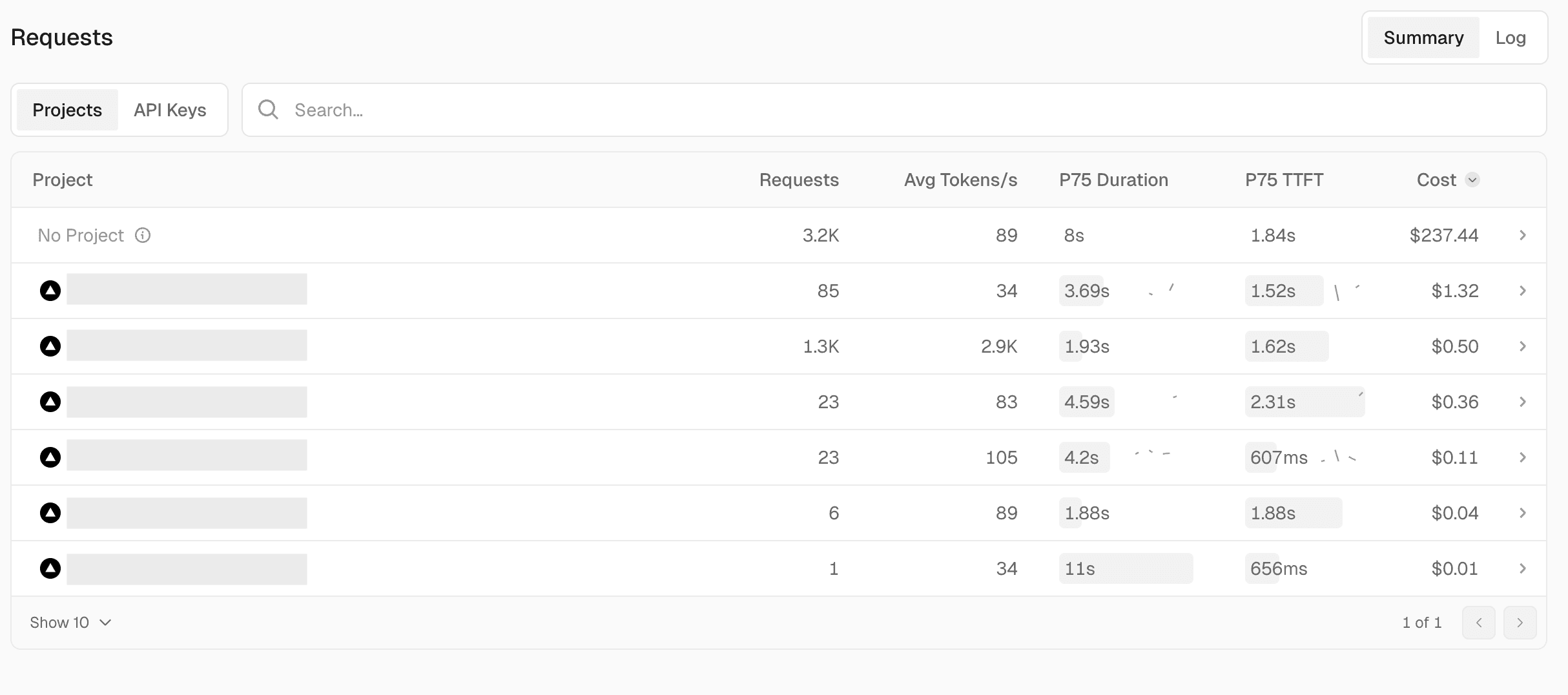 The Requests section displays summaries by project, API key, and a detailed log of all requests. Each summary includes request count, average tokens, P75 duration, P75 TTFT, and cost for the specified time frame.