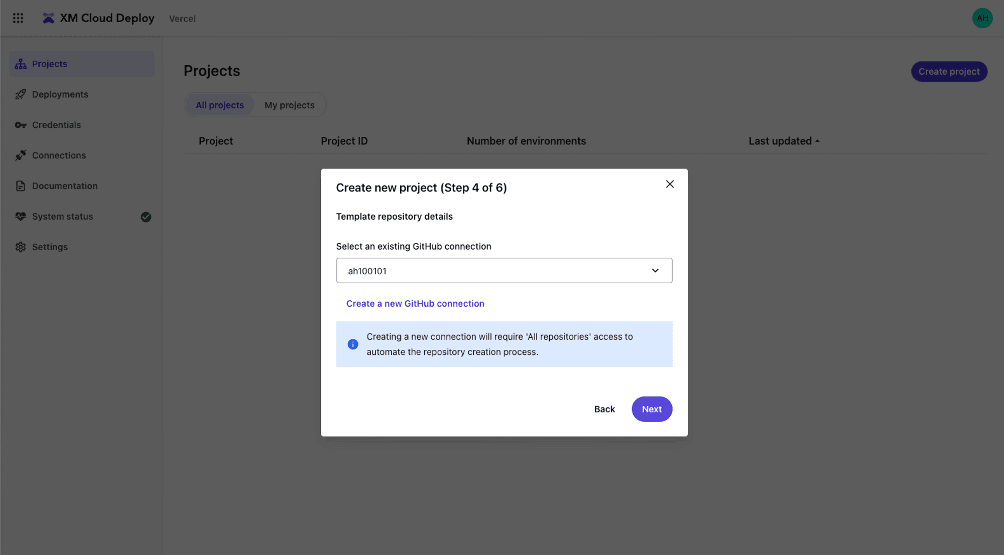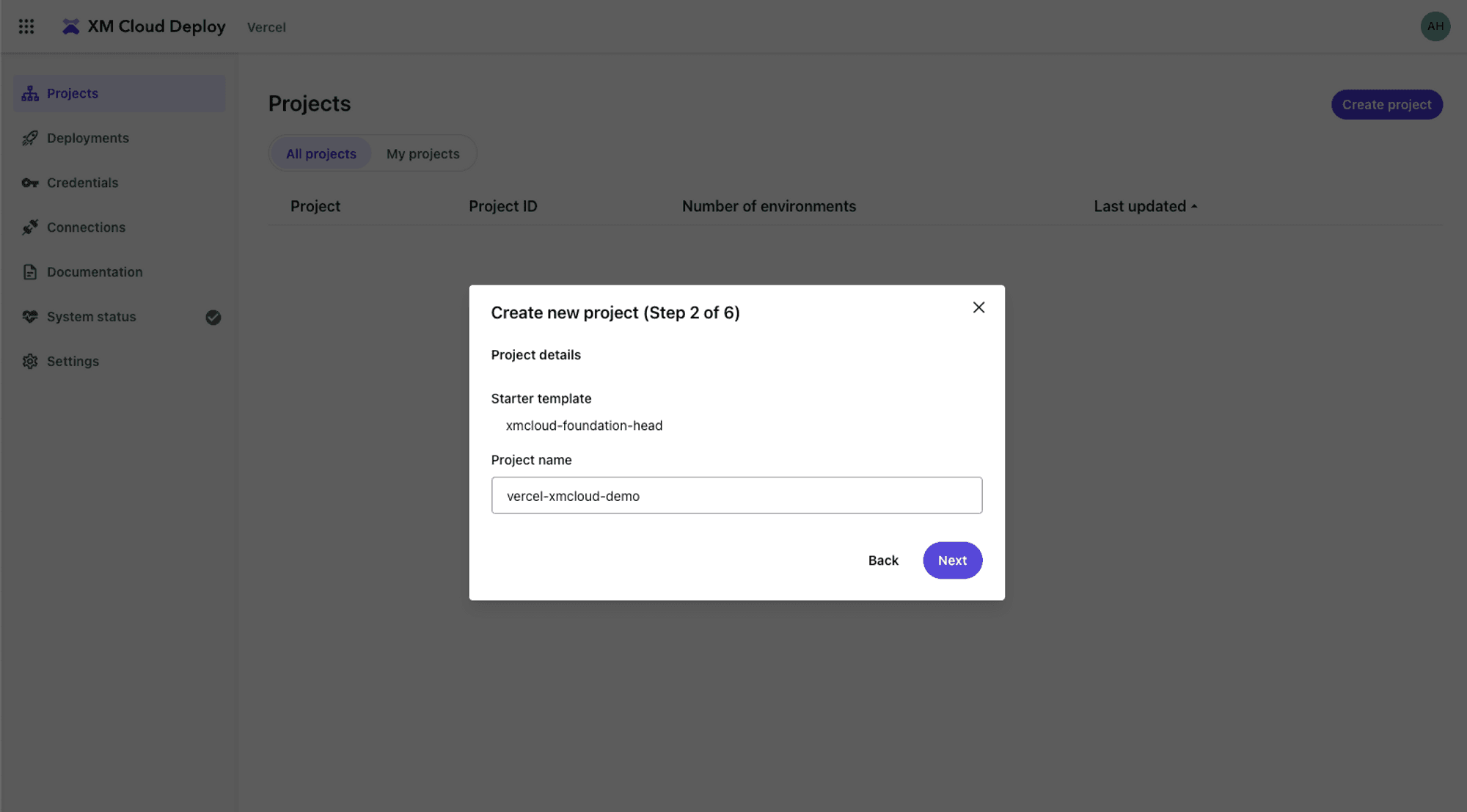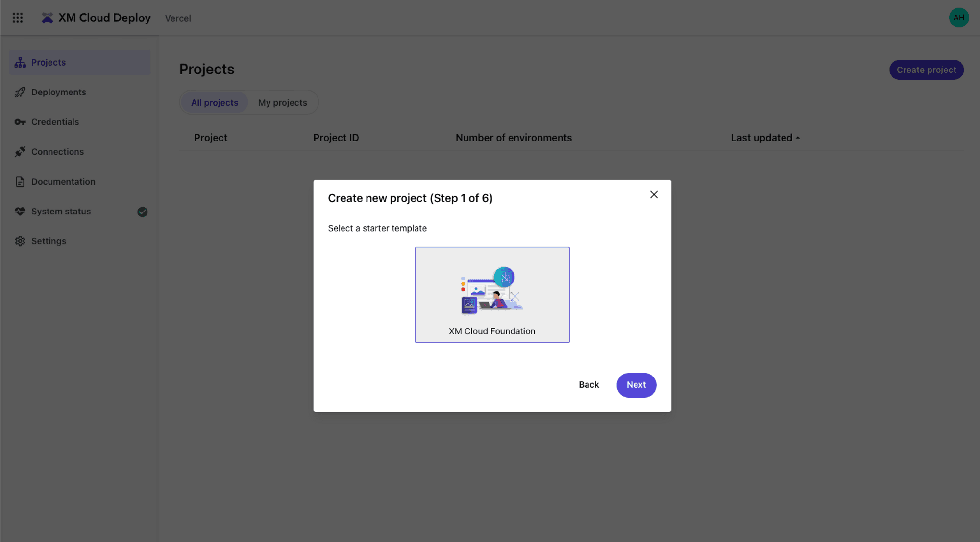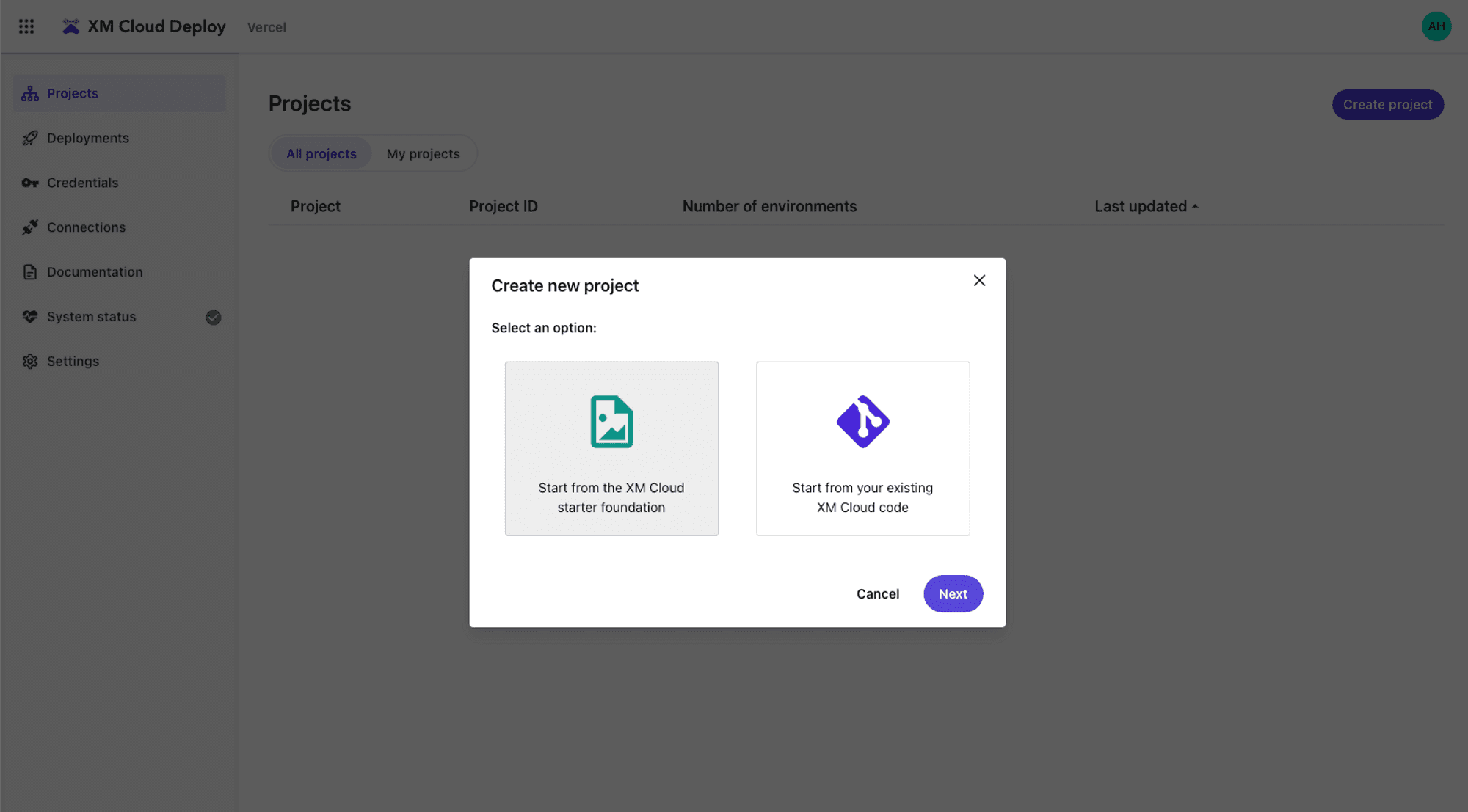 In the Create new project dialog, select Start from the XM Cloud starter foundation. Proceed by selecting Next.