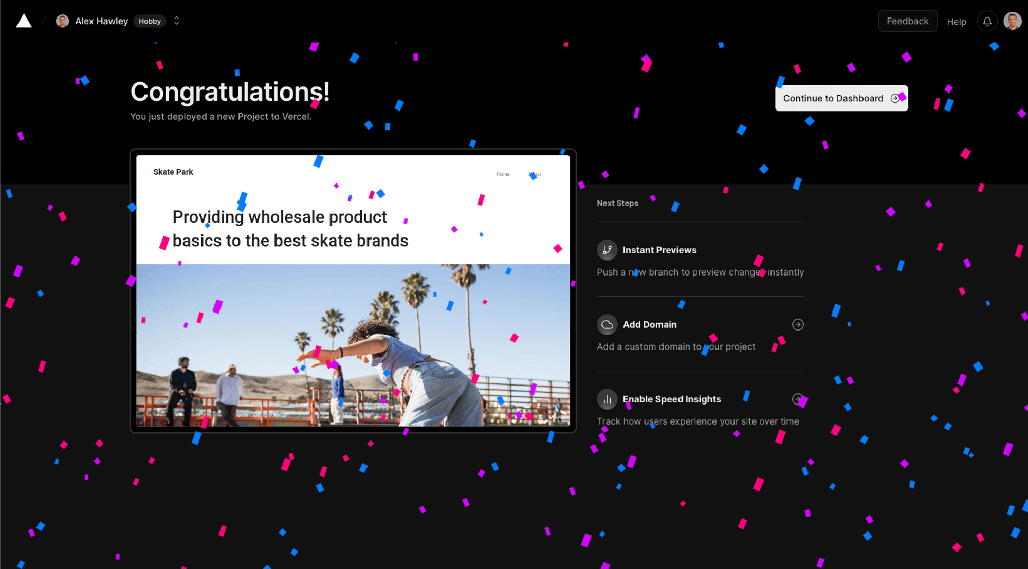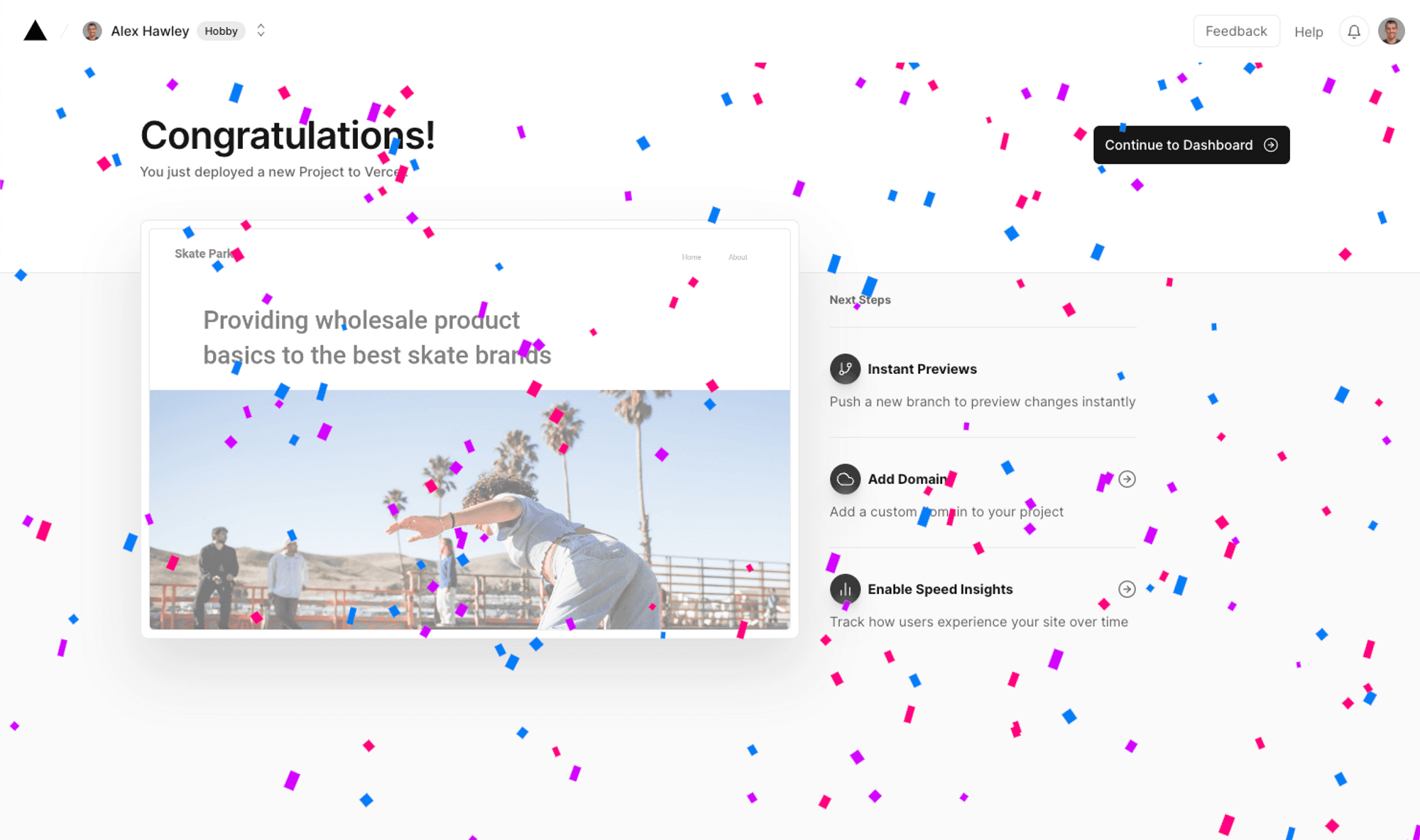 FETCH_WITH,JSS_APP_NAME,GRAPH_QL_ENDPOINT,SITECORE_API_KEY, andSITECORE_API_HOSTenvironment variables to the Environment Variables section..env.localJSS_APP_NAME='your-jss-app-name' GRAPH_QL_ENDPOINT='your-graphql-endpoint' SITECORE_API_KEY='your-sitecore-api-key' SITECORE_API_HOST='host-from-endpoint' FETCH_WITH='GraphQL'Select "Deploy" and your application will be live on Vercel!