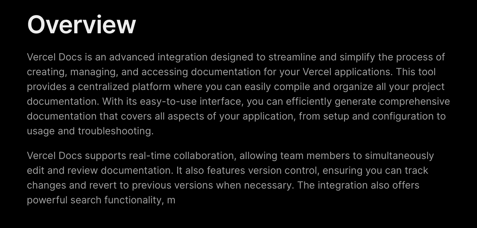 You are recommended to include links to get started guides for using your product with specific frameworks. Once your product is added by a Vercel user, these links appear on the product's detail page of the user's Vercel dashboard.