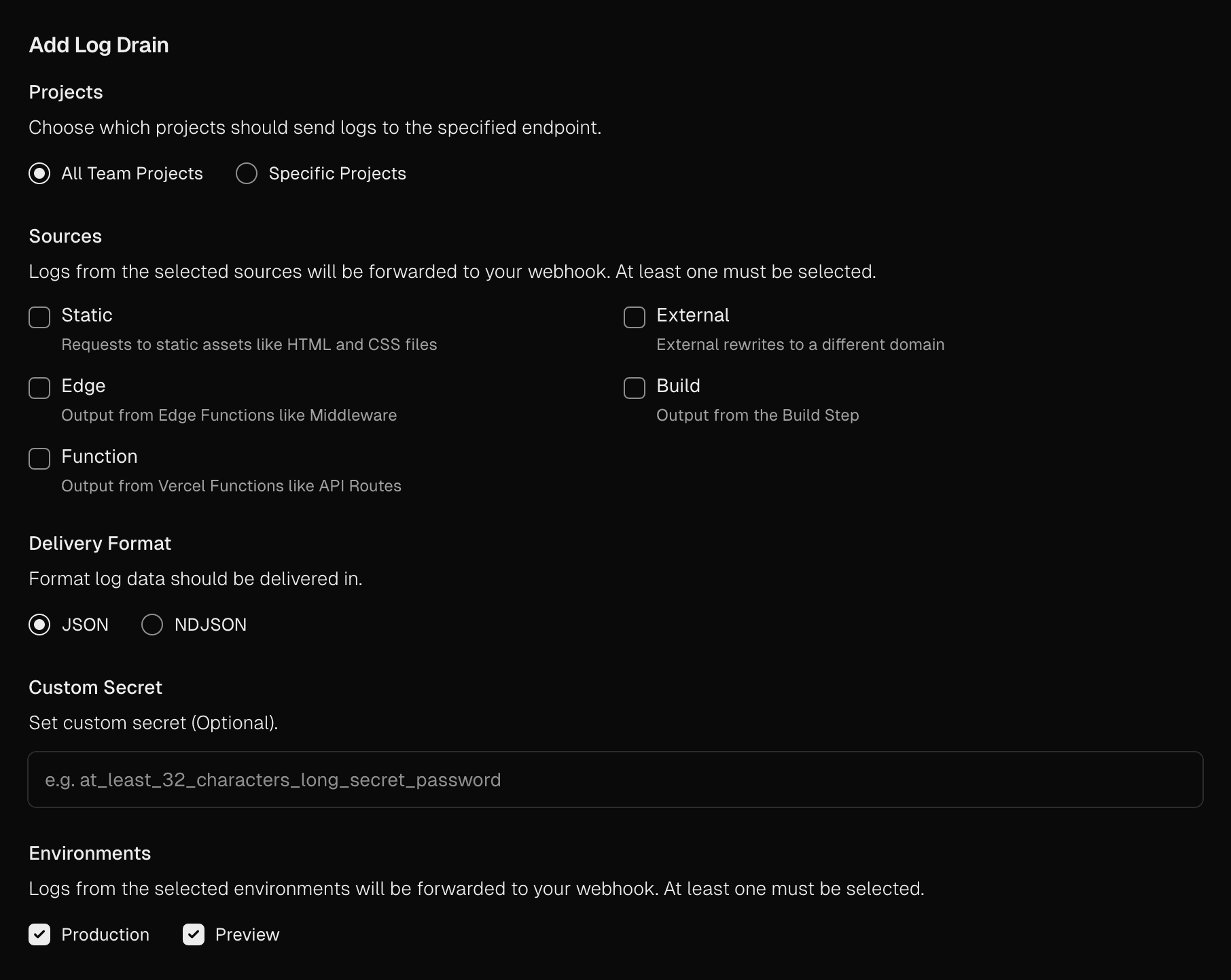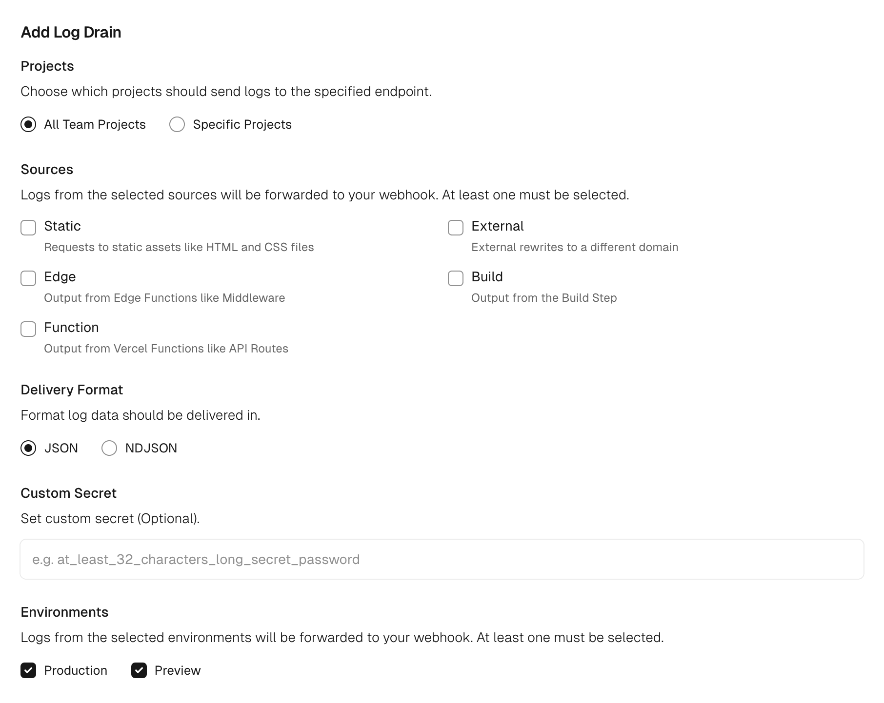 Log Drains allow you to export your log data, making it easier to debug and analyze. You can configure Log Drains through the Vercel dashboard or through one of our Log Drains integrations.