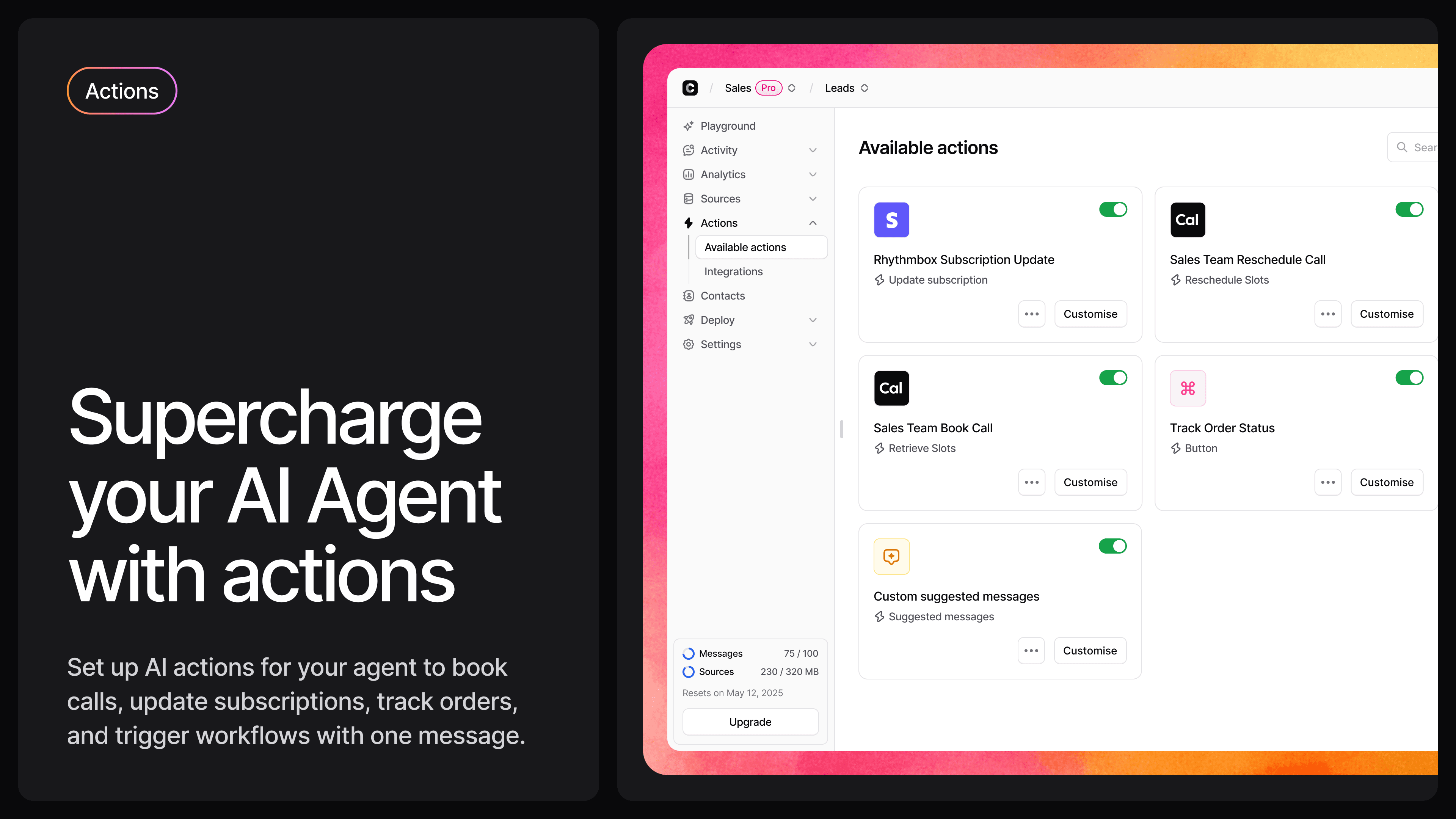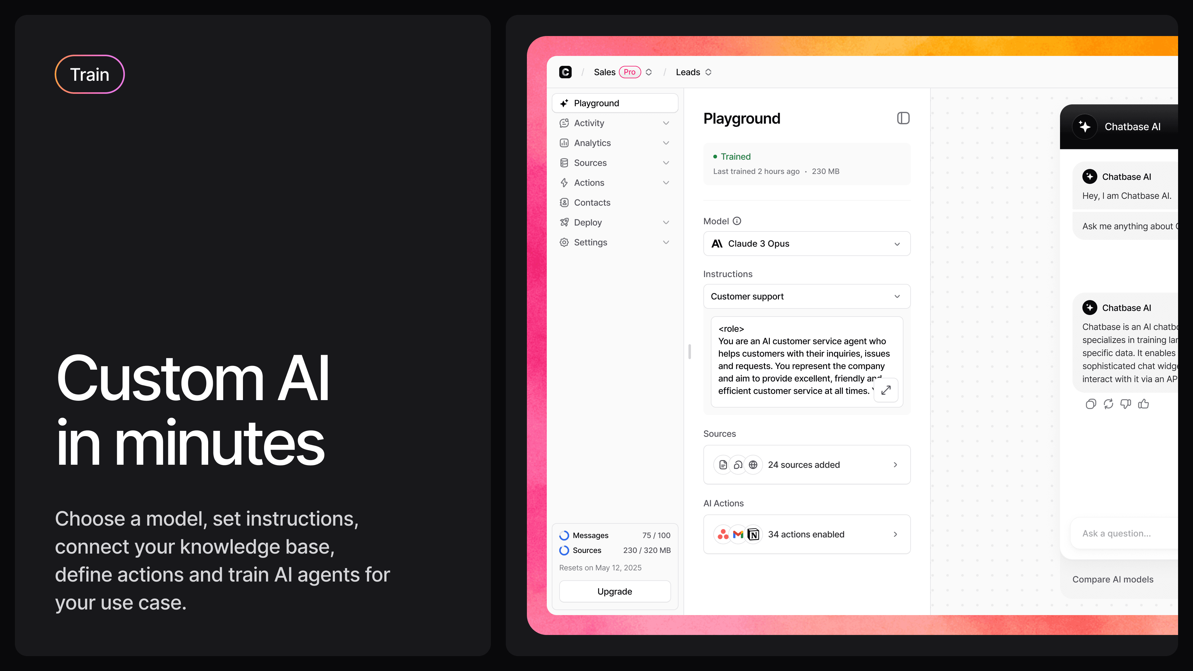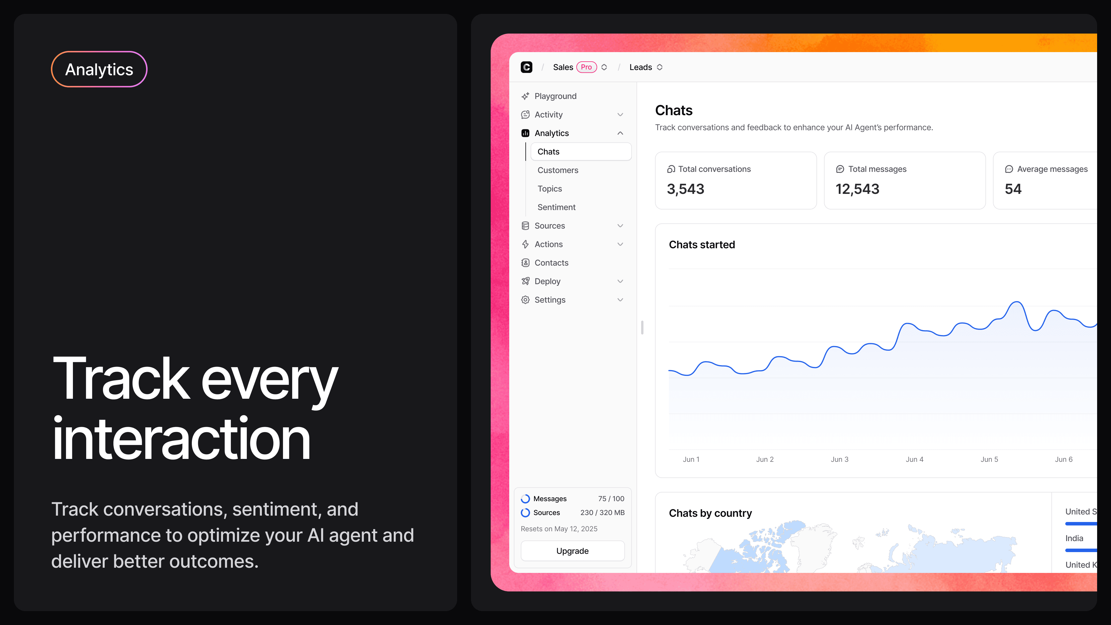Chatbase is a complete no-code platform for building, deploying, and optimizing AI support agents over your own data. Trusted by over 9,000 businesses across 140+ countries, Chatbase empowers teams to deliver actionable customer experiences — swiftly, securely, and intelligently.