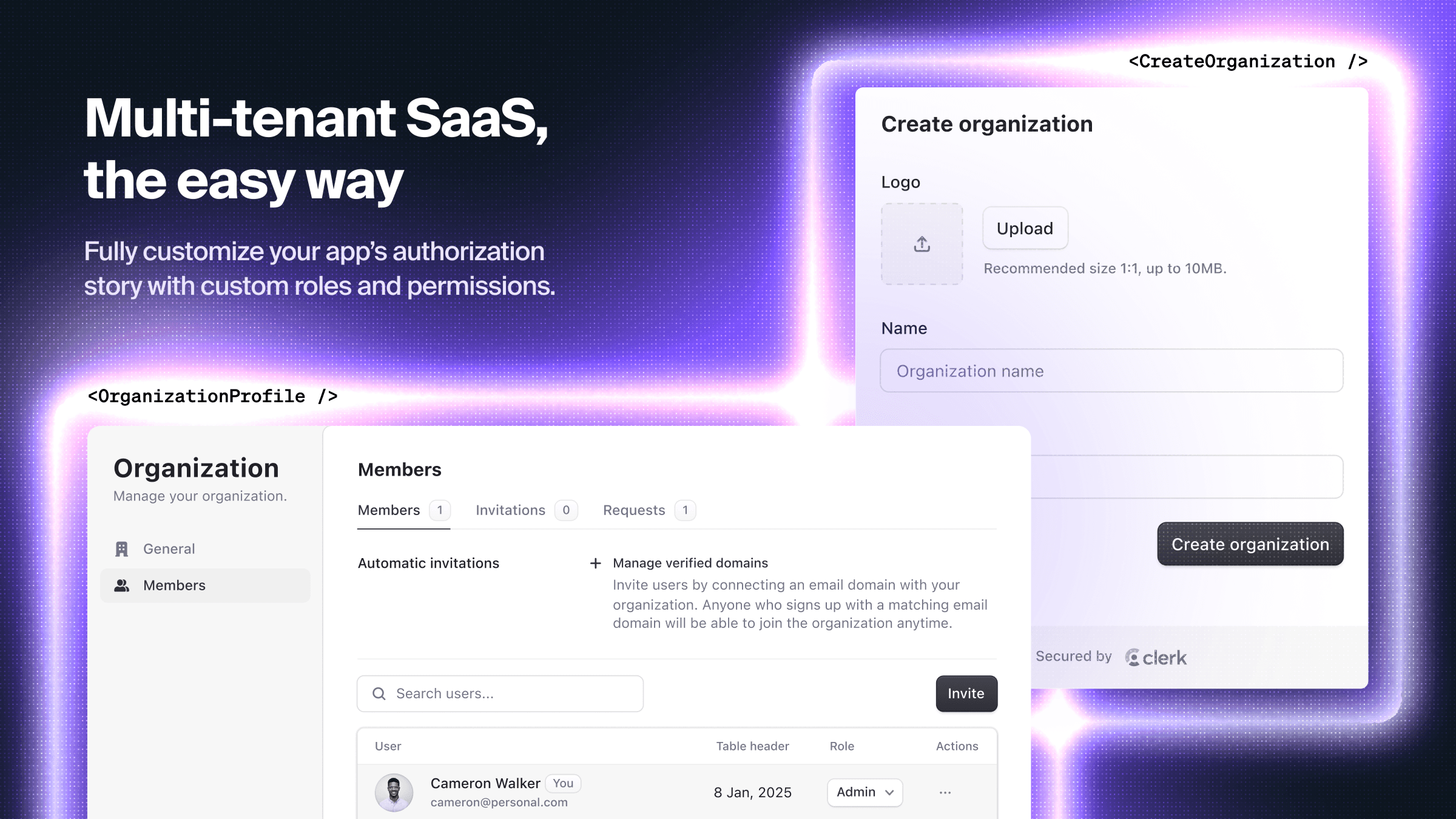 - Scalable support for B2B SaaS use cases via Clerk Organizations - including multi-tenancy, RBAC