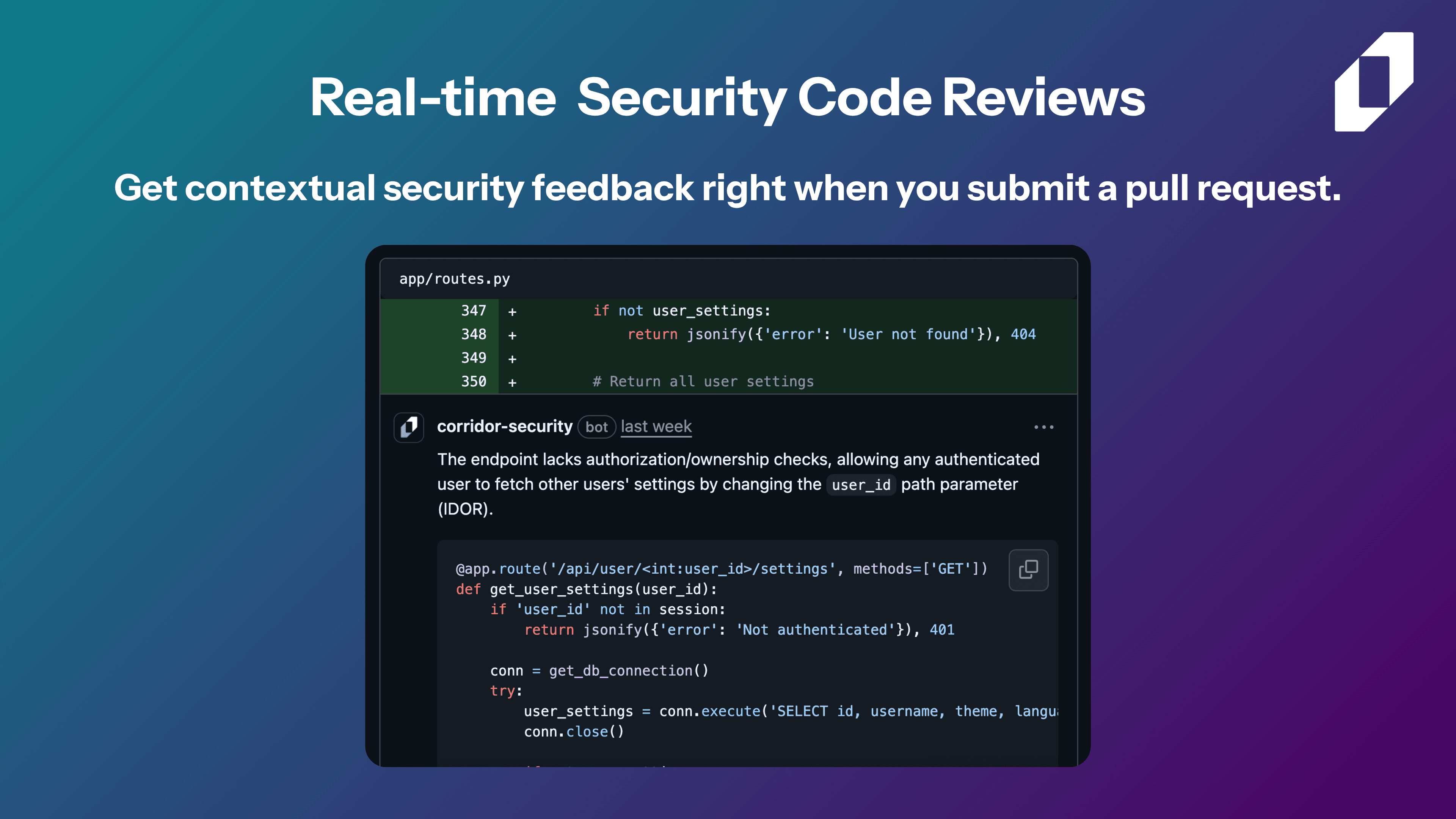 - Corridor reviews every pull request for security, catching vulnerabilities before they can make it into prod.