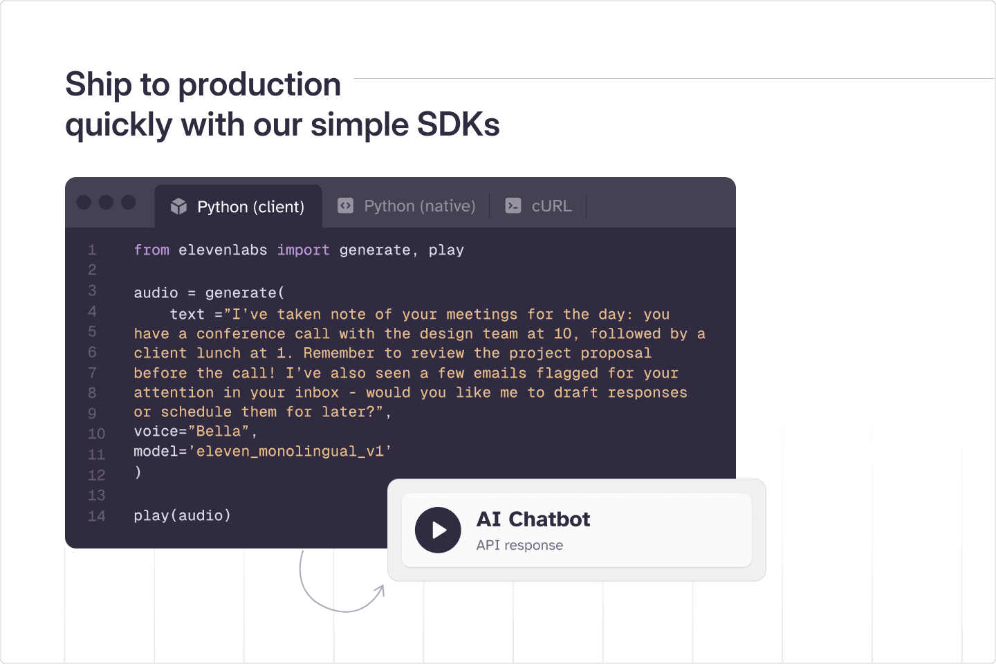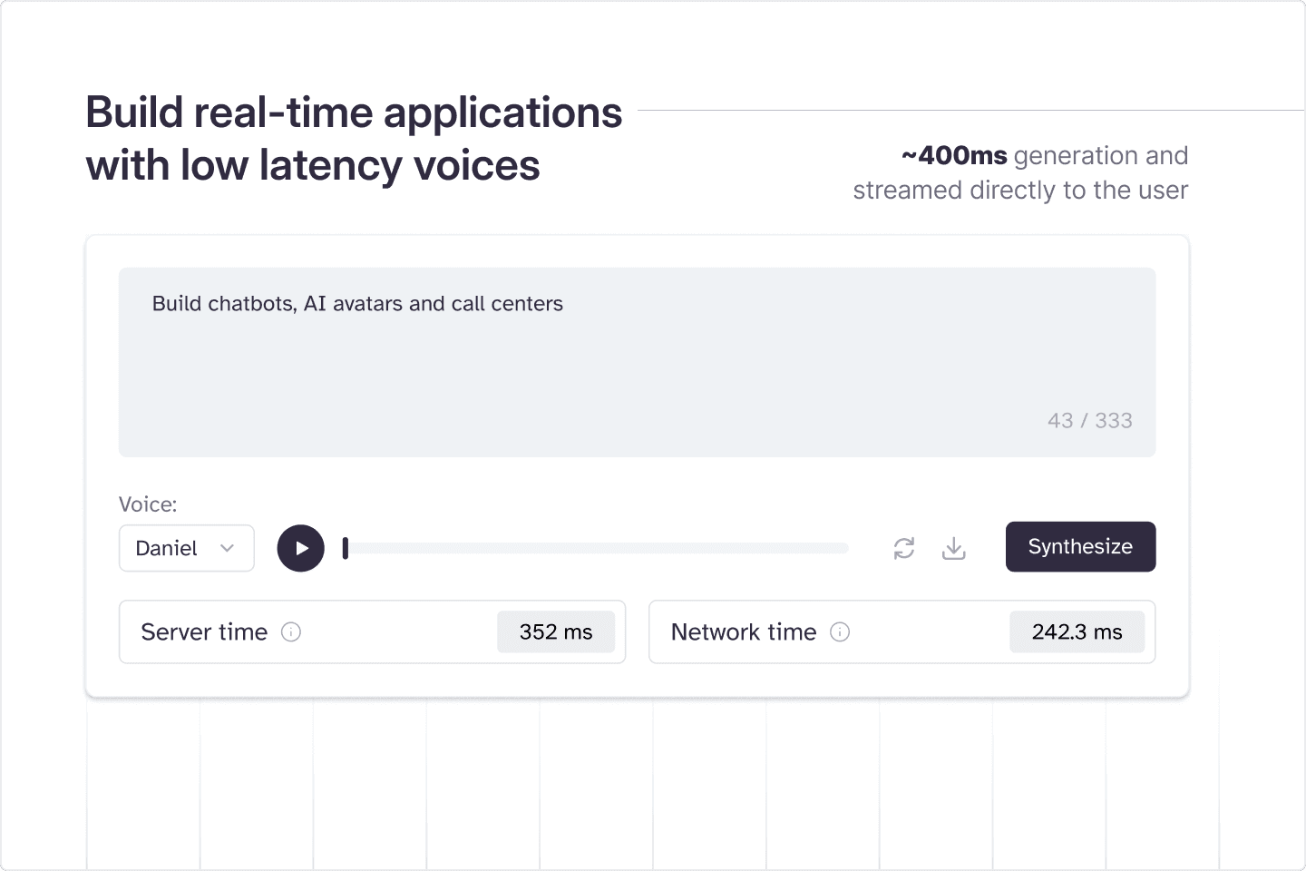 Elevate your projects with the fastest and most powerful AI text to speech & voice API. Quickly generate AI voices in multiple languages for your chatbots, agents, LLMs, websites, apps and more.