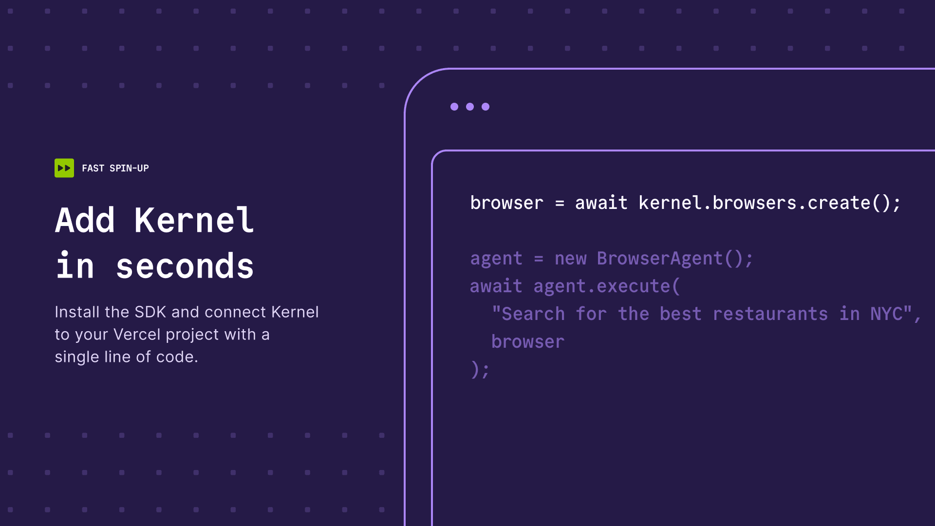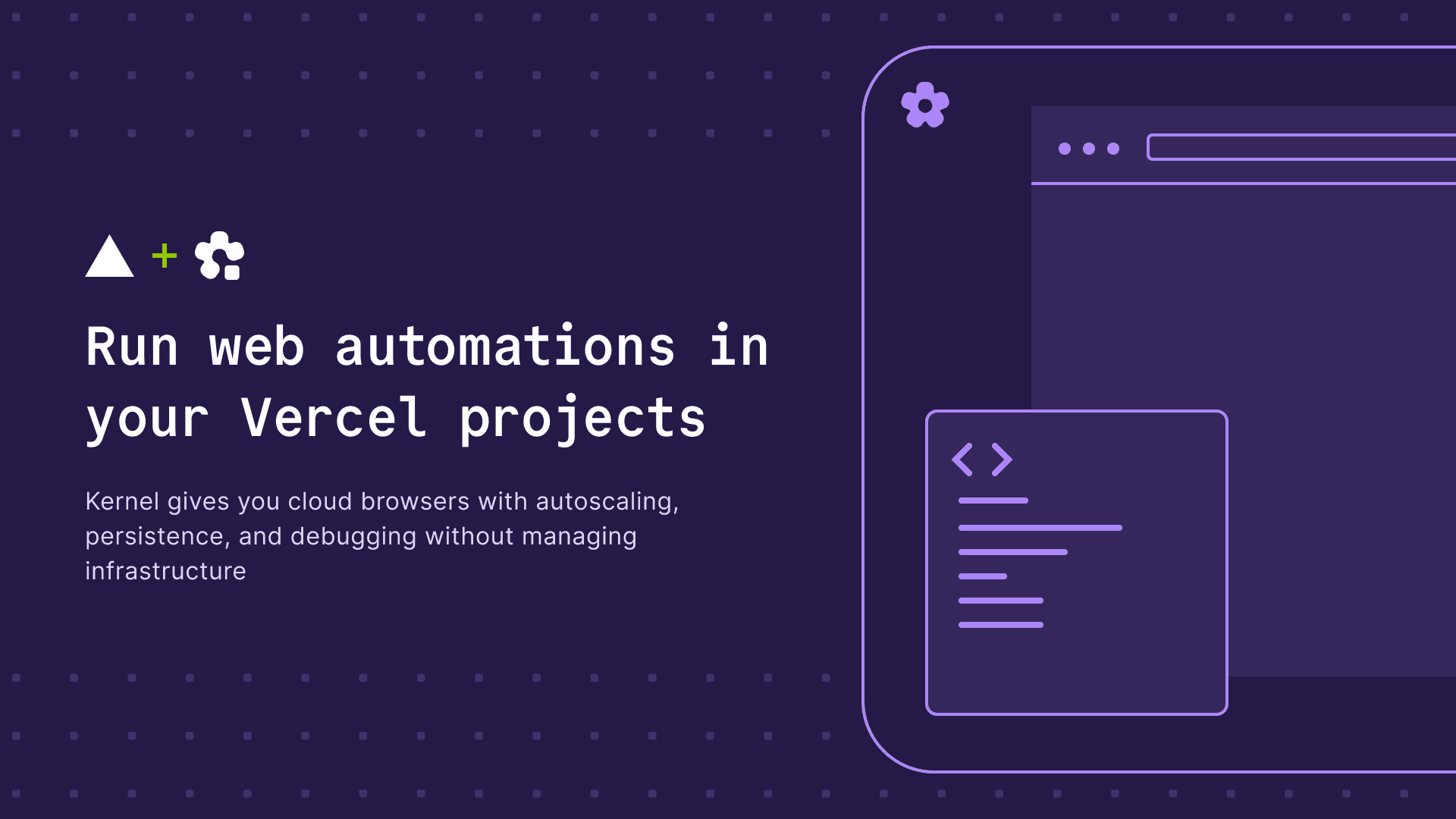 Kernel works out of the box with every major agent and automation framework whether you're using Browser Use, Stagehand, Playwright, Puppeteer, or Computer Use via OpenAI, Anthropic, or Gemini. Instantly deploy and scale any of these workloads on Vercel using Kernel's browsers.