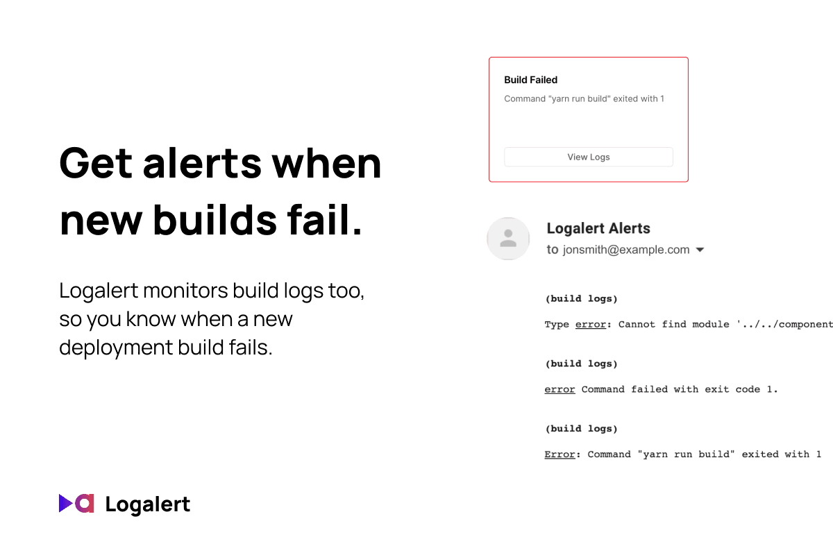 Get notified via email as soon as a user experiences an error so you can fix it faster. It also monitors build logs so you get alerts when new deployments fail.