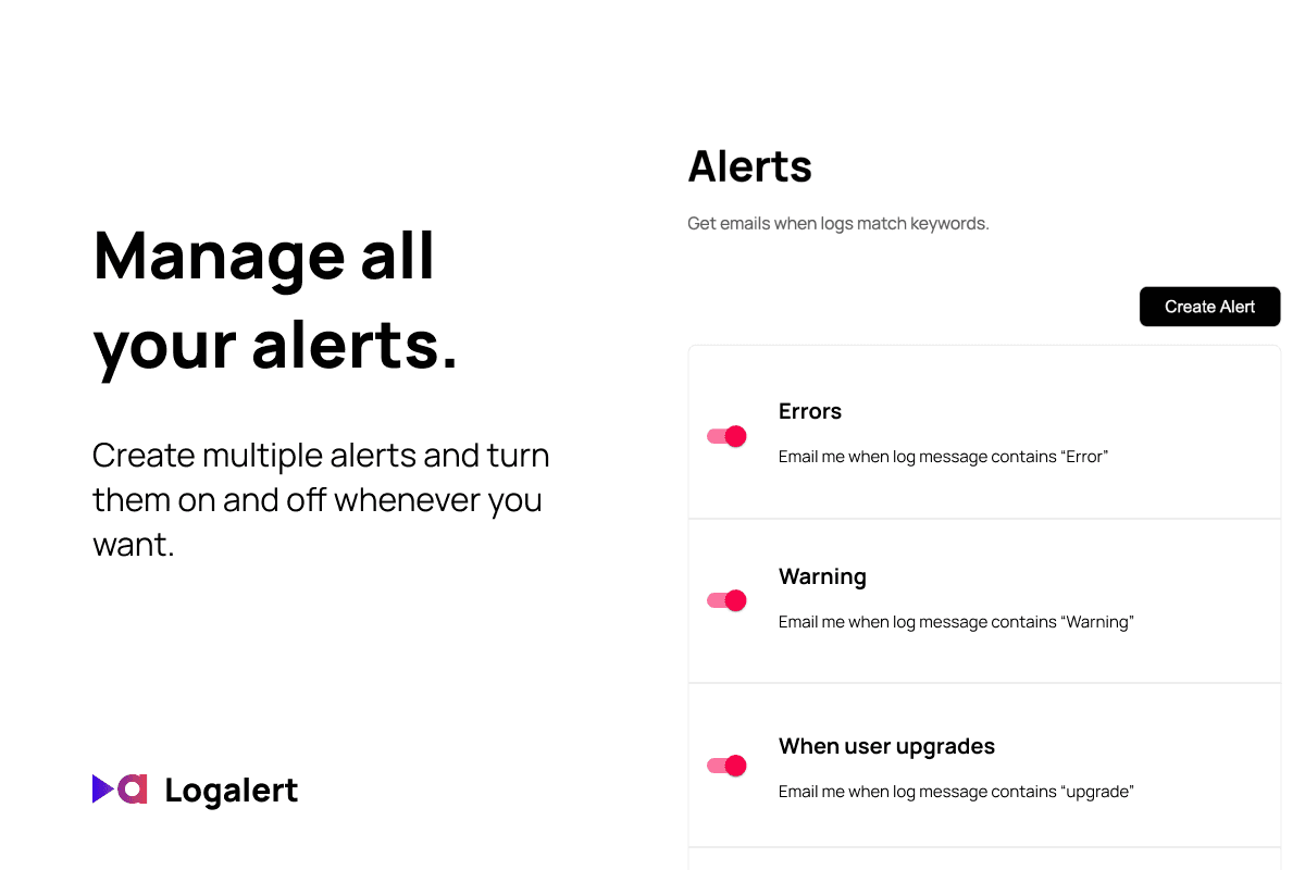 After installing the integration, you can create more alerts in the Logalert Dashboard. For more instructions on how to set up your first alert, check out our Quickstart Guide.