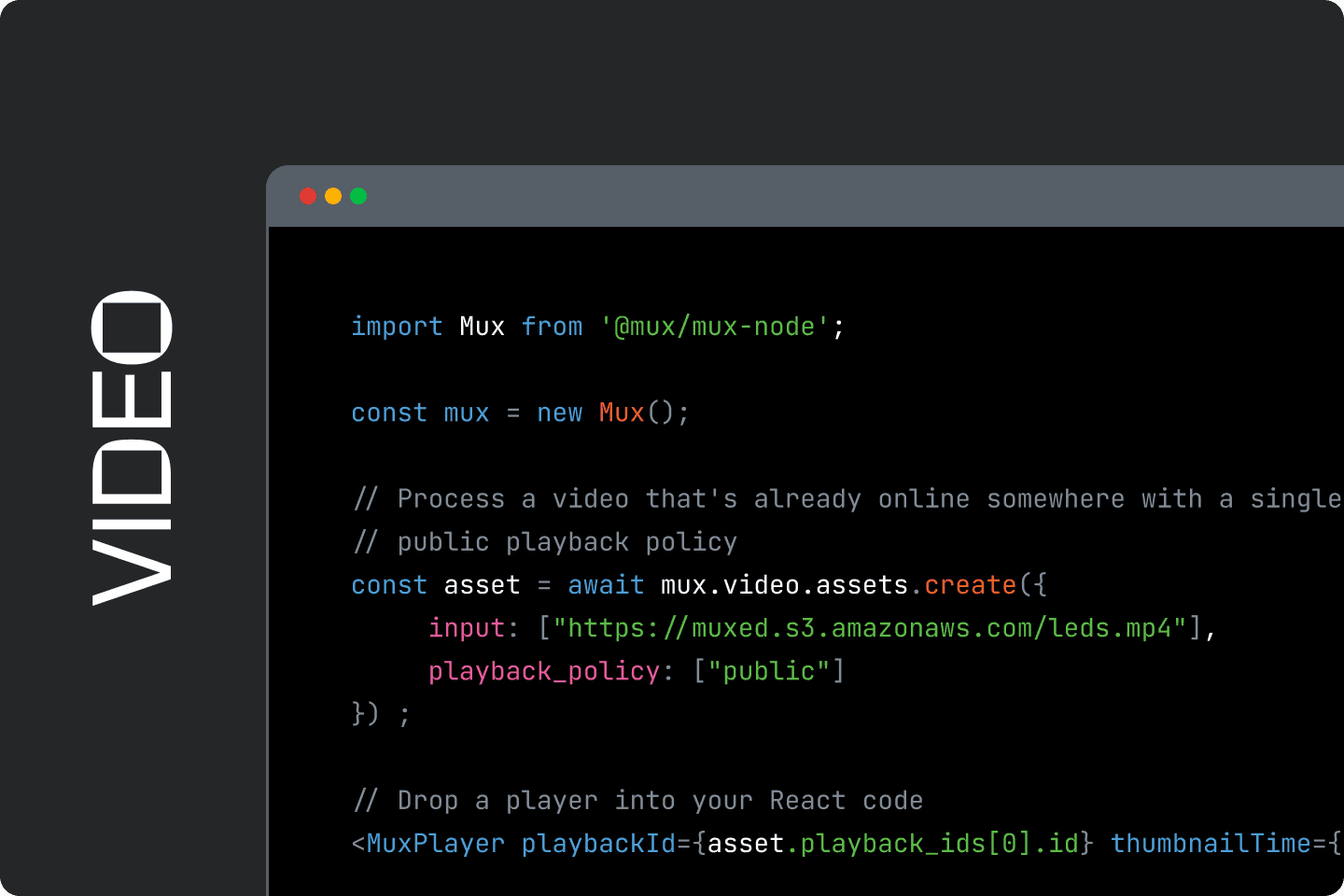Add powerful, reliable video experiences to your application in minutes with Mux. As an API-first platform, Mux simplifies everything from upload and storage to live streaming and on-demand playback.