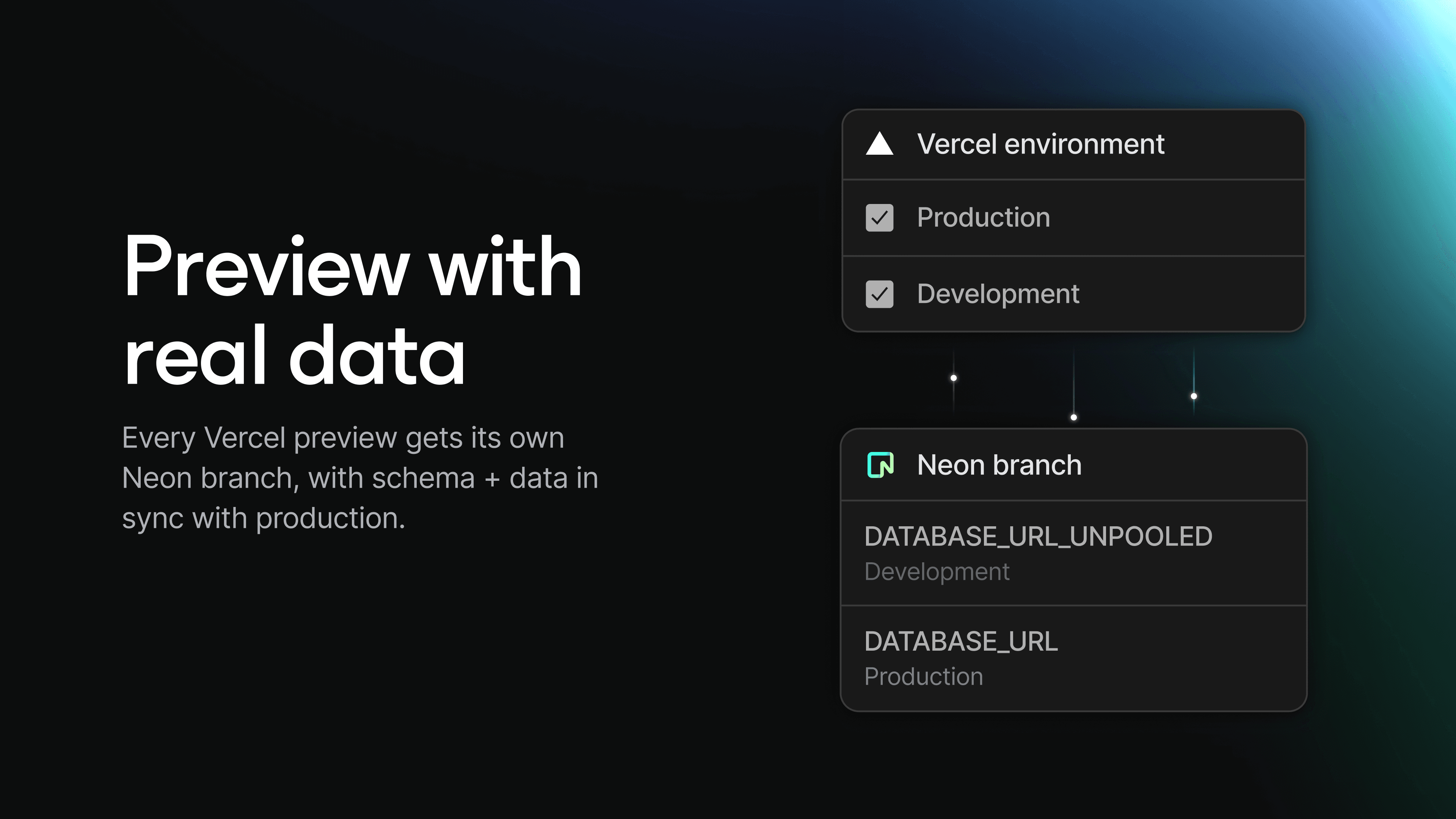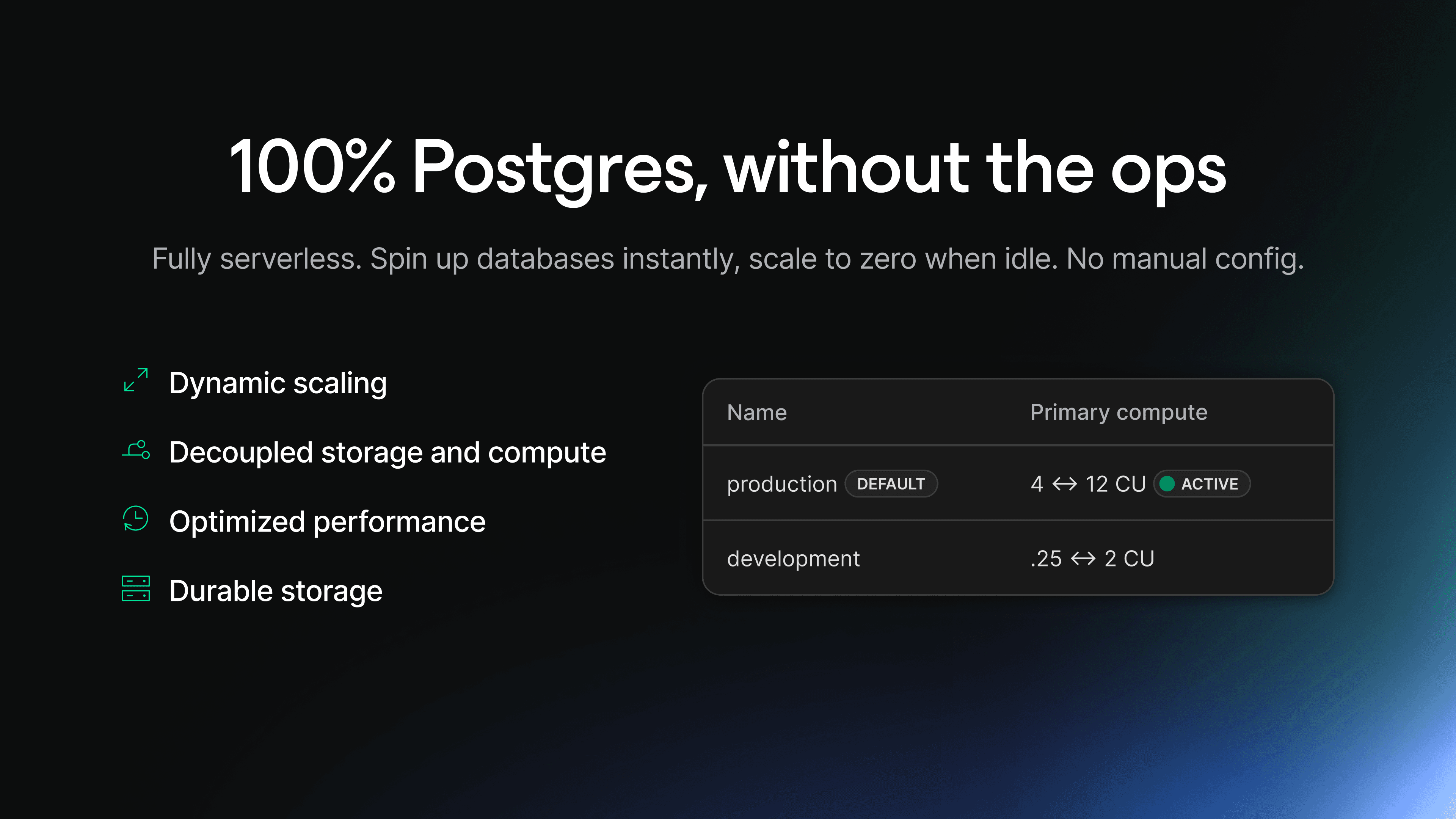 By integrating Neon with Vercel, you can deploy a fully managed Postgres database in seconds with features like database branching, autoscaling, scale-to-zero, read replicas, authorization, a Drizzle Studio-powered table editor, an AI-enabled SQL client, instant point-in-time recovery, time travel queries, a low-latency serverless driver, and more. Neon offers a generous Free Plan and paid plans that grow with you from prototype to enterprise.